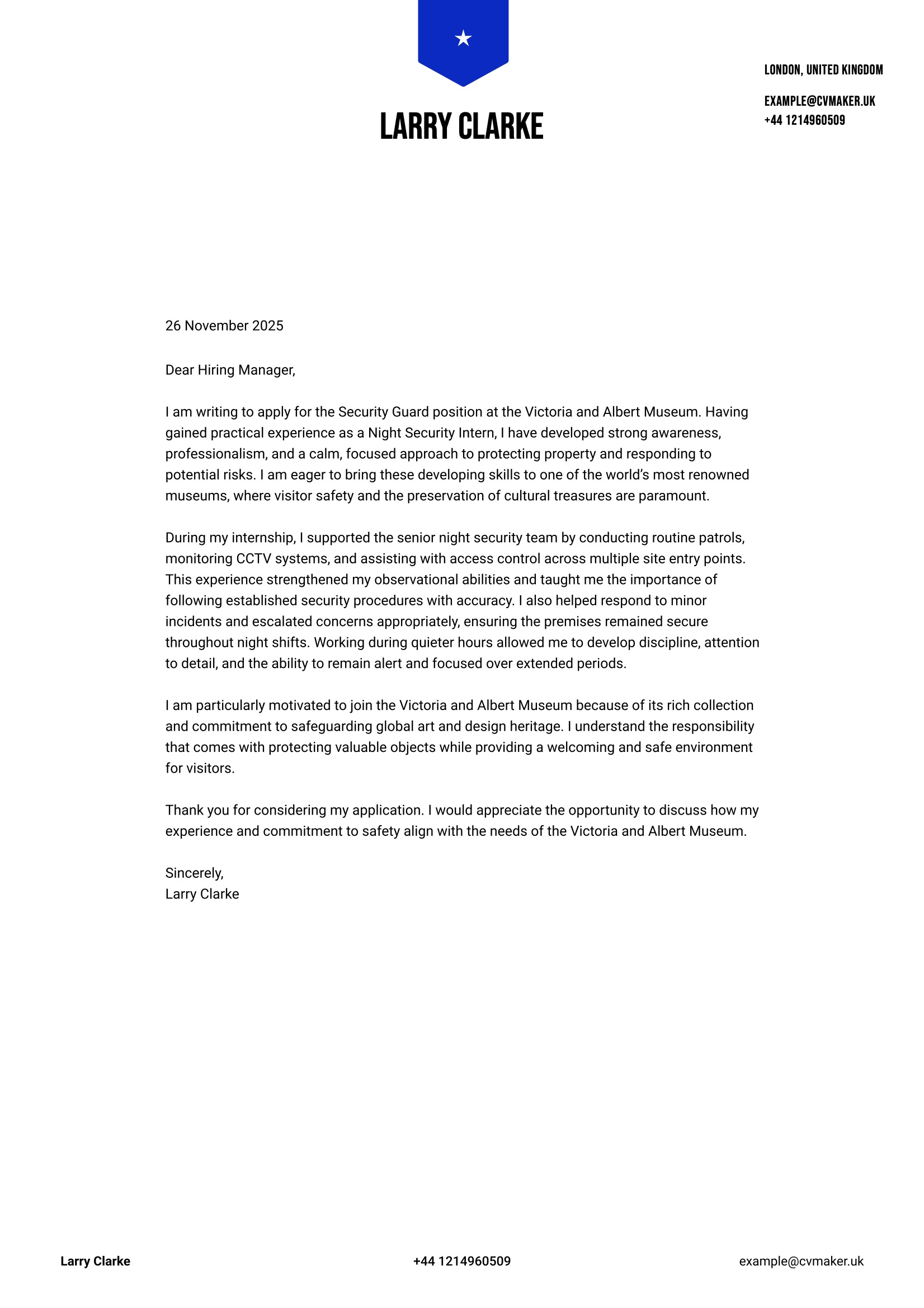 A security guard cover letter is usually one page long, highlighting key qualifications and experiences relevant to the role. If you’re a school leaver exploring career opportunities, your cover letter might be shorter and more concise. For a detailed guide, check out our article on cover letter length.